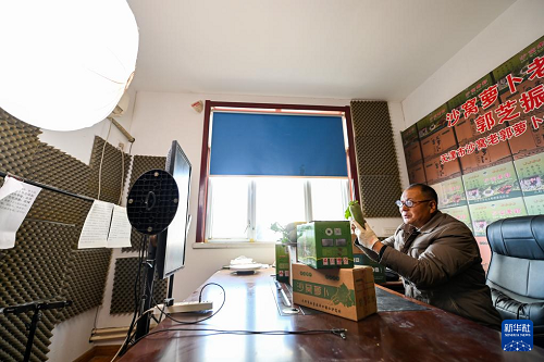 11月20日,在天津市西青區(qū)辛口鎮(zhèn)一家蘿卜專業(yè)合作社,農(nóng)戶在直播推廣沙窩蘿卜。(新華社記者 趙子碩 攝)