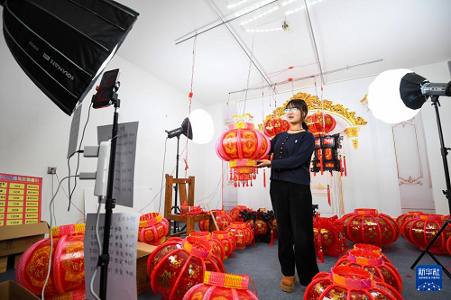 12月10日,在河北省石家莊市藁城區(qū)屯頭村一家宮燈銷售處,直播人員進行線上銷售。(新華社發(fā) 張曉峰 攝)
