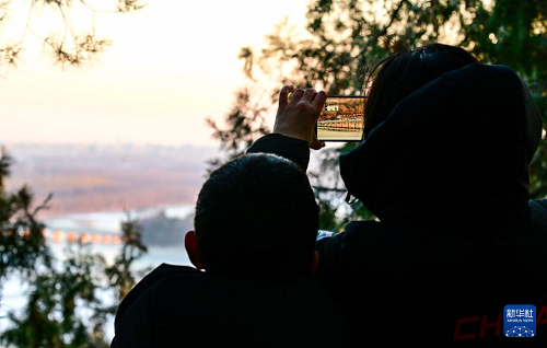 12月21日,游客在頤和園萬壽山上拍攝十七孔橋“金光穿洞”美景。(新華社記者 陳曄華 攝)