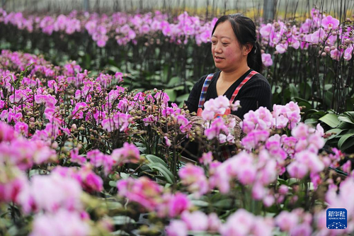 12月23日,在江蘇省連云港市農(nóng)商控股集團(tuán)農(nóng)業(yè)科技公司花卉大棚,工作人員對(duì)蝴蝶蘭進(jìn)行組盆。(新華社發(fā) 耿玉和 攝)