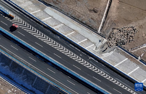 在新疆和靜縣,牧民趕著羊群從烏尉高速公路路基下穿過(12月23日攝,無人機照片)。(新華社記者 王菲 攝)