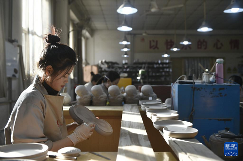 12月25日,工作人員在河北省曲陽(yáng)縣一家定瓷生產(chǎn)企業(yè)的車間里加工定瓷產(chǎn)品。(新華社記者 魯鵬 攝)