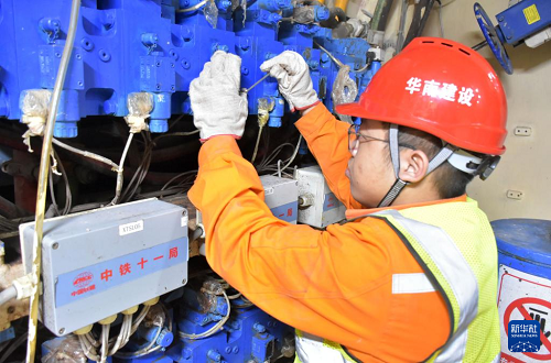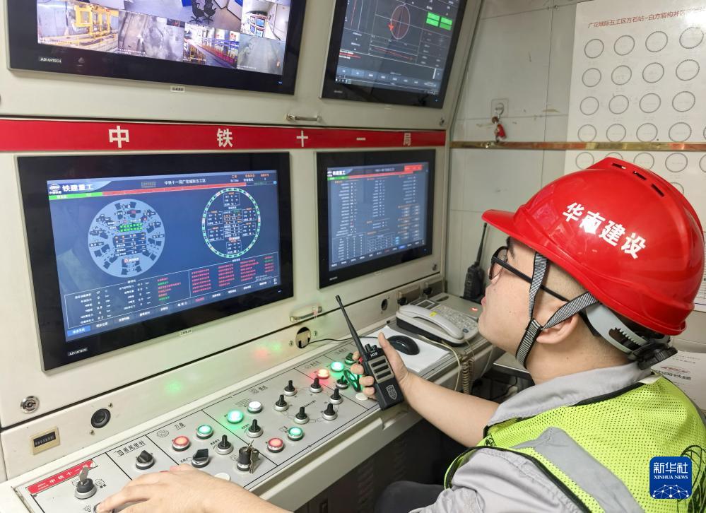 1月7日,工作人員在施工現(xiàn)場的控制室里調(diào)控機(jī)械設(shè)備。(新華社記者 盧漢欣 攝)