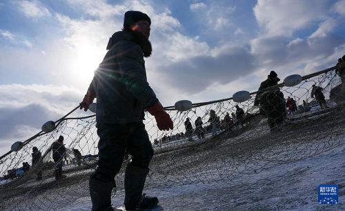 1月7日,在吉林省松原市,漁民將漁網(wǎng)拽出冰面。(新華社記者 顏麟蘊(yùn) 攝)