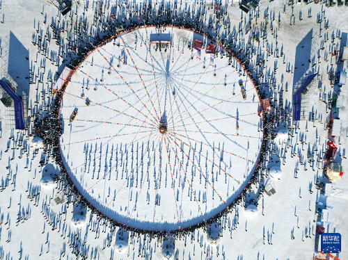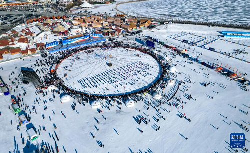 1月8日,在吉林省松原市,人們參加吉林·查干湖第24屆冰雪漁獵文化旅游節(jié)開幕式(無人機(jī)照片)。(新華社記者 顏麟蘊(yùn) 攝)