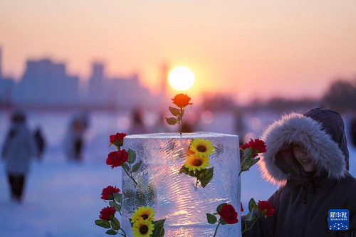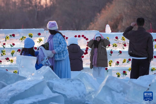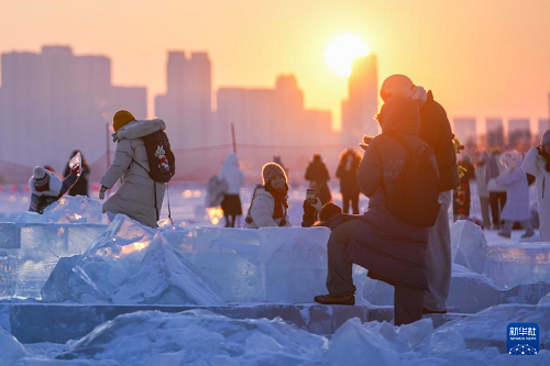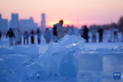 時下,“冰城”哈爾濱市正值冰雪旅游旺季。松花江哈爾濱段一處采冰場,由于大量堆積高純凈度的冰塊,而被游客稱為“鉆石?!?,成為網(wǎng)紅景區(qū)。只要是晴好天氣,都會有許多游客來到“鉆石?!本皡^(qū),欣賞浪漫的落日美景。
