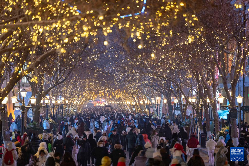 時(shí)下,“冰城”哈爾濱正值冰雪旅游季。夜幕降臨,百年老街中央大街被璀璨燈火點(diǎn)亮,游客置身其中,仿佛步入流動(dòng)的冰雪藝術(shù)長廊,令人流連忘返。