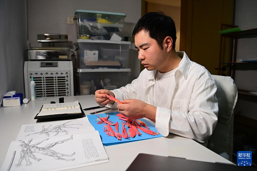 糖藝師張勃在工作室對比參考書調(diào)整糖藝零部件的尺寸(1月13日攝)。(新華社記者 鄒競一 攝)