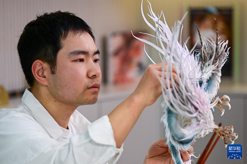 糖藝師張勃在制作糖藝作品《山海經(jīng)應(yīng)龍》(1月13日攝)。(新華社記者 鄒競一 攝)