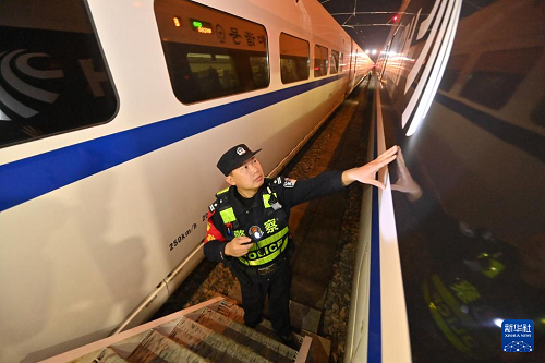 2月2日凌晨,南寧鐵路公安局南寧公安處長崗嶺站派出所民警在南寧動車所檢查列車安全情況。(新華社記者 陸波岸 攝)