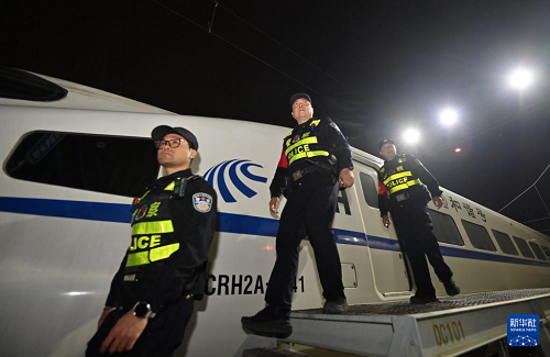 2月2日凌晨,南寧鐵路公安局南寧公安處長崗嶺站派出所民警在南寧動車所巡邏。(新華社記者 陸波岸 攝)