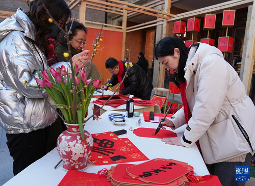 2月8日,書法家們?cè)谟螆@會(huì)上為市民寫春聯(lián)和福字。(新華社記者 劉穎 攝)