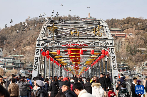 2月9日,人們?cè)谔m州市城關(guān)區(qū)中山橋上游覽。(新華社發(fā) 侯崇慧 攝)