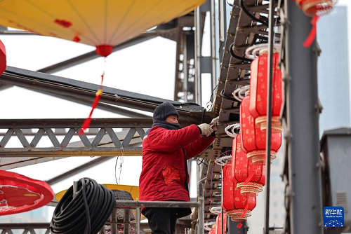 2月9日,工作人員在蘭州市城關(guān)區(qū)中山橋上懸掛燈籠。(新華社發(fā) 侯崇慧 攝)