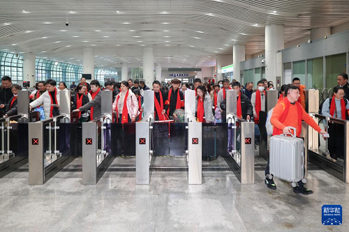 2月11日,棗陽(yáng)籍務(wù)工團(tuán)體在上海站優(yōu)先檢票進(jìn)站。(新華社記者 王翔 攝)