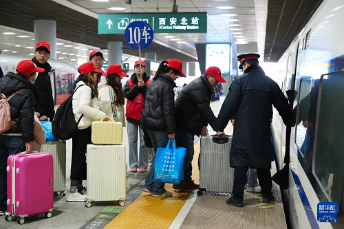 2月24日,來(lái)自西安市周至縣的務(wù)工人員在西安北站登上G1922次列車。(新華社記者 邵瑞 攝)