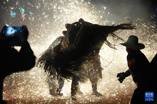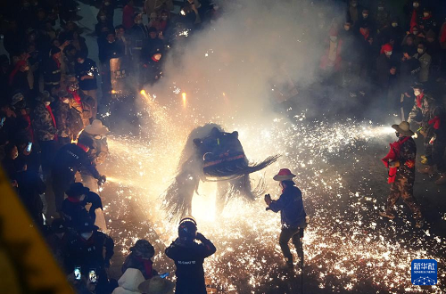 3月2日,在陜西旬陽市蜀河鎮(zhèn)蜀河社區(qū),表演人員在用煙花“燒獅子”。(新華社記者 邵瑞 攝)