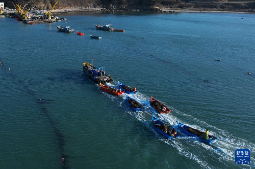 3月9日,在山東省榮成市愛倫灣海洋牧場海帶養(yǎng)殖區(qū),養(yǎng)殖工人收獲海帶(無人機(jī)照片)。(新華社發(fā) 李信君 攝)