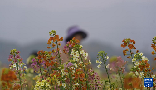 3月15日,游客在彩色油菜花田里游玩。(新華社記者 周密 攝)