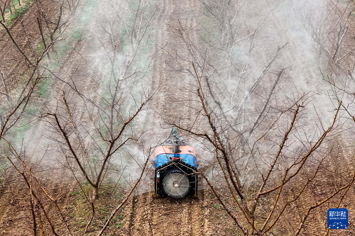3月19日,山西省運(yùn)城市平陸縣張村鎮(zhèn)的農(nóng)民為果樹噴灑農(nóng)藥(無人機(jī)照片)。(新華社記者 曹陽 攝)