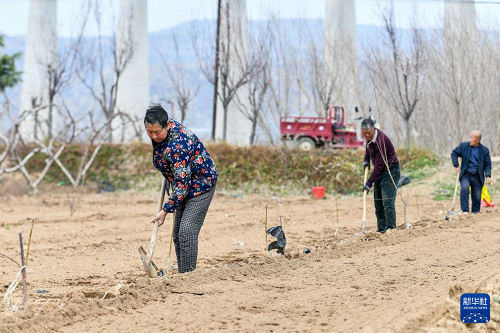 3月19日,山西省運(yùn)城市平陸縣張村鎮(zhèn)的農(nóng)民在種植樹苗。(新華社記者 曹陽 攝)