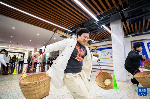 3月19日,學(xué)生在湖南農(nóng)業(yè)大學(xué)參加農(nóng)趣運(yùn)動(dòng)游戲——競(jìng)速搬運(yùn)。(新華社記者 陳思汗 攝)