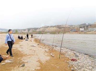 當日下午3時許,蘭州晨報記者在雁白大橋西側(cè)的黃河岸邊看到12把魚竿一字排開,3名釣魚者坐在旁邊沙灘上正在等待魚兒上鉤,還有兩名中年男子正在周圍撒網(wǎng)。在相隔十多米處,記者發(fā)現(xiàn)還有兩名男子分別撐著魚竿釣魚,有一名捕魚者在撒網(wǎng)?!斑@是雙面粘漁網(wǎng),河內(nèi)稍大一些的魚兒只要撞進網(wǎng)里就擺脫不了。”一名捕魚男子得意地說。