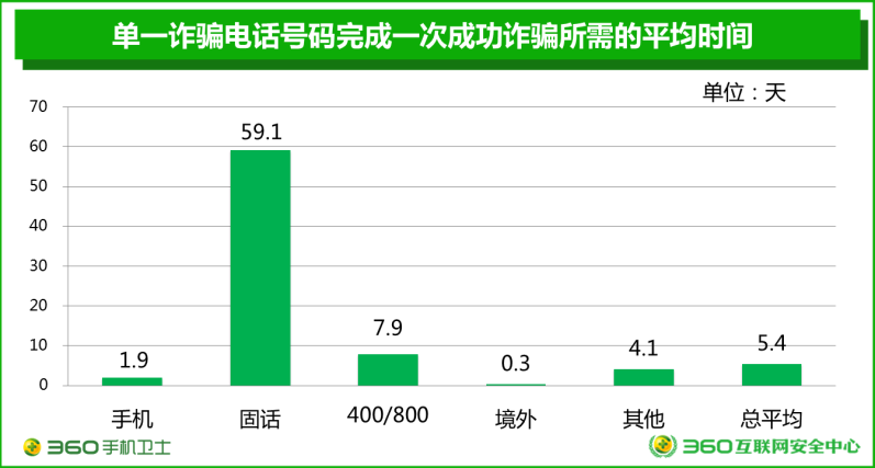 《報告》以2016年10月份360手機衛(wèi)士關(guān)于詐騙電話的各項監(jiān)測數(shù)據(jù)為基礎(chǔ),進行了抽樣分析。假定如果用戶接聽詐騙電話的時長大于30分鐘,那么犯罪分子完成整個詐騙全過程的幾率就比較高,比較接近于一次成功的詐騙。綜合計算,平均約5.4天,犯罪分子就能夠使用一個電話號碼完成一次成功或接近成功的詐騙。