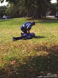 一名目擊導游說:“剛才有兩個客人在悉尼草坪上方便,讓警察看見了。警察追他們,他們提著褲子跑。他們惱羞成怒,要打警察。警察一個過肩摔,把一個男的摔地上骨折了。現(xiàn)在救護車,警車都過來了。”