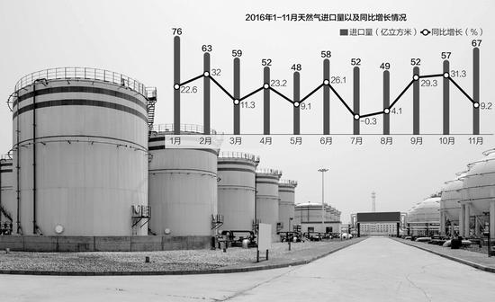 數(shù)據(jù)顯示,2016年1~11月天然氣進口量4798萬噸,同比增長21.6%,天然氣進口量占產(chǎn)量與進口量之和的比重已達到34.9%,比去年同期提高了3.8個百分點。