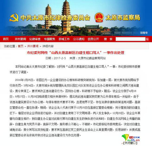 2月5日太原市紀(jì)委官方網(wǎng)站發(fā)布《市紀(jì)委對(duì)網(wǎng)傳“山西太原高新區(qū)白建生粗口罵人”一事作出處理》。