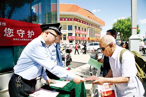 本報(bào)訊 5月15日上午,忻府區(qū)公安局在七一北路體育廣場警務(wù)室門前開展了以“與民同心、為您守護(hù)”為主題的打擊和防范經(jīng)濟(jì)犯罪宣傳日活動(dòng),受到市民群眾的歡迎。