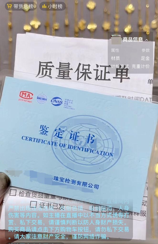 圖為某平臺店鋪主播展示其所售黃金產品的“鑒定證書”。
