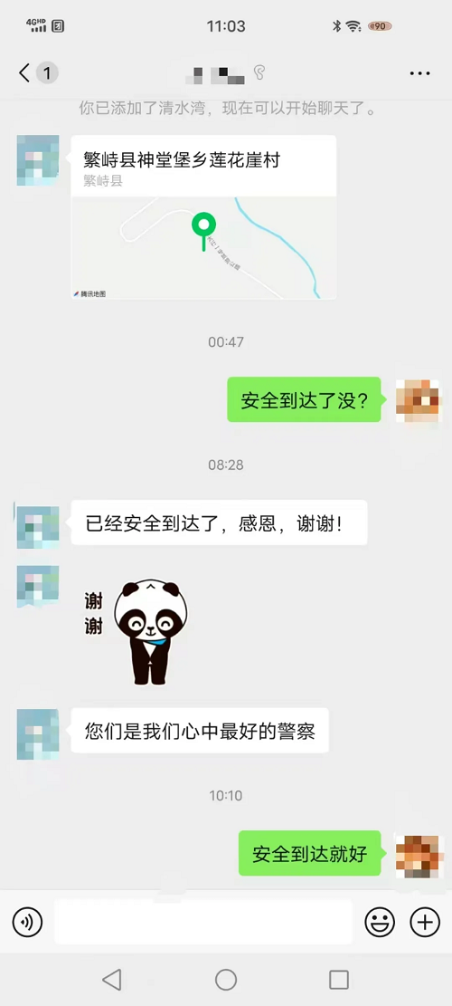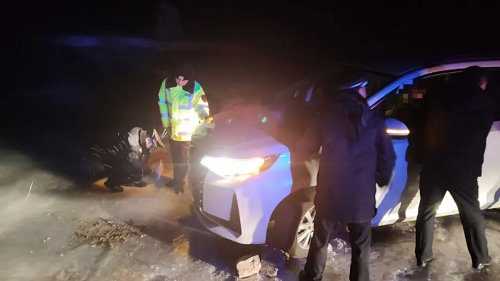 接到報警后,神堂堡派出所民警迅速通過電話聯(lián)系報警人,得知車上共有七人,多為婦女兒童,民警首先安撫游客情緒,并在確定具體地點(diǎn)后,立即與神堂堡交警中隊(duì)民警驅(qū)車趕往事發(fā)地。到達(dá)現(xiàn)場后,民警了解到,報警人張某與家人朋友自駕前往五臺山旅游,開到蓮花崖大峽谷山區(qū)路段時由于路面有冰導(dǎo)致車輛打滑沖出路面,車輛正被困在一處斜坡處,距離前面的深溝只有一米左右,進(jìn)退兩難,無法動彈。此時,車上幾名游客已凍得瑟瑟發(fā)抖,情況不容樂觀。民警們第一時間制定救援措施,他們不畏嚴(yán)寒、相互配合,經(jīng)過長時間的努力,終于將被困車輛從冰面推到了無冰路段。車輛脫困,游客對民警們的及時救援表示了由衷的感謝,緊緊握住民警的手,激動地說:“非常感謝警察同志的幫助,您們是我們心中最好的警察!”