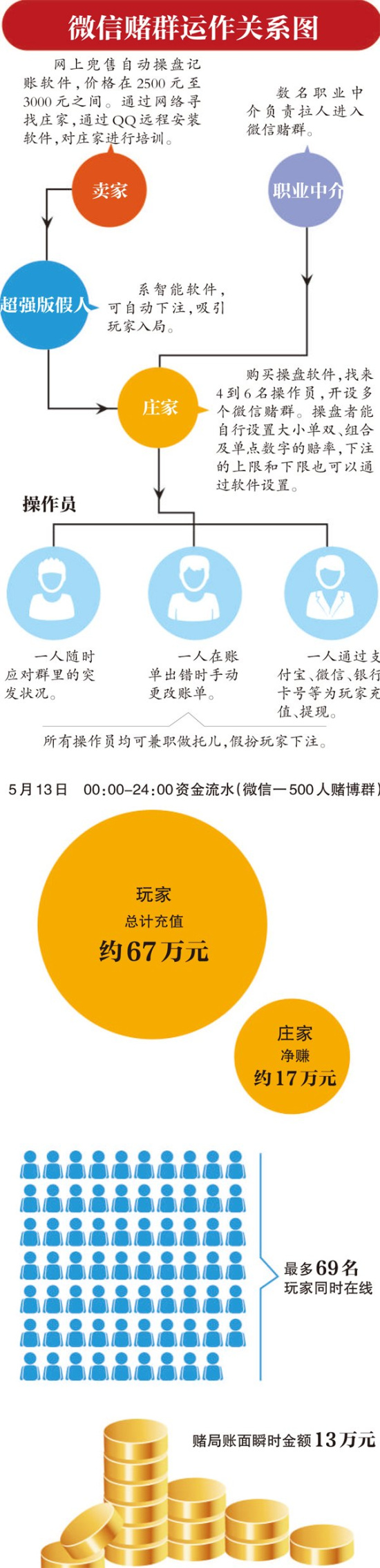 6月12日,某報(bào)記者臥底微信賭場(chǎng)的報(bào)道給人們揭開(kāi)了“微信賭場(chǎng)”的可怕內(nèi)幕:開(kāi)一局只需5分鐘,下注、開(kāi)局、下注……賭局像車(chē)輪滾動(dòng),你甚至來(lái)不及眨幾下眼,也不知道錢(qián)輸給了誰(shuí),成千上萬(wàn)賭資就已蒸發(fā)。一位賭徒這樣描述,“血淋淋的,押下去是一串沒(méi)有感覺(jué)的數(shù)字,玩完才發(fā)現(xiàn)輸了一大筆,這比現(xiàn)實(shí)中的賭場(chǎng)恐怖太多?!?/p>