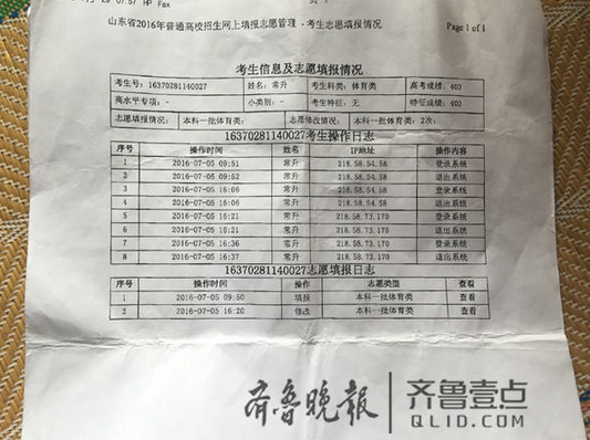 記者注意到,常升在7月5日上午9點(diǎn)51分登陸自己的賬號(hào)填報(bào)好了志愿之后便離開(kāi),但是當(dāng)天下午4點(diǎn)多,常升的賬號(hào)再次在同一臺(tái)電腦上登陸,而接下來(lái)賬號(hào)又在另外一個(gè)IP地址上連續(xù)登陸兩次,并且用完了兩次修改志愿的機(jī)會(huì)?!拔揖偷顷戇^(guò)一次,在遲老師的電腦上?!背If(shuō),后面的三次操作他都不知道是誰(shuí)所為。根據(jù)IP地址提供的線索,無(wú)論是誰(shuí)修改了常升的志愿,都在遲老師的電腦上進(jìn)行過(guò)操作,然后又用另一臺(tái)電腦將常升的改志愿次數(shù)用完。常升的準(zhǔn)考證和密碼一直在自己手里保管,唯一有機(jī)會(huì)修改他志愿的就是自己的同窗好友郭某?!拔覀冴P(guān)系很好,我填志愿的時(shí)候他就在旁邊,我也沒(méi)防著他?!背If(shuō),事發(fā)之后他找過(guò)郭某,對(duì)方也私下承認(rèn)了修改了常升志愿的事實(shí),原因則是郭某擔(dān)心常升的分?jǐn)?shù)更高,他怕常升擠掉自己,讓自己沒(méi)學(xué)上。隨后,為了挽回常升的損失,雙方家長(zhǎng)進(jìn)行了商談。圖為常升的賬號(hào)修改志愿的記錄。