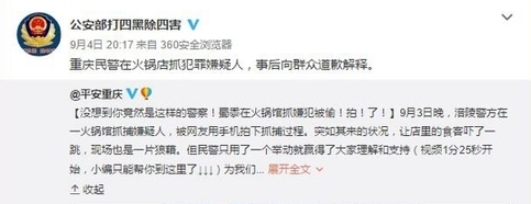 事后,有媒體了解到這名道歉者是來自重慶市涪陵區(qū)公安局荔枝派出所的一名民警。據(jù)他介紹,當時是正在對一名長期吸販毒的犯罪嫌疑人實施抓捕。由于嫌疑人吸食毒品精神亢奮且隨身攜有刀具,抓捕過程比較激烈,不少店內(nèi)客人都起身圍觀,有些還拿出手機拍攝。抓捕結(jié)束后,帶隊民警第一時間找來餐館老板,亮明身份后表示警方會妥善處理餐館損失,并且特意向店內(nèi)顧客道歉,于是就有了視頻中顯示的畫面。