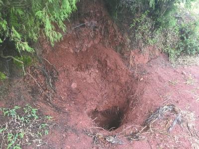 順著吳大爺?shù)闹敢?,記者穿過一片蘆葦?shù)?,整條山路雜草叢生,無路可尋。在山頂?shù)囊豢冒貥湎?,記者找到了尸體被埋處,一個約半米深、寬半米的泥坑,樹根裸露在外,周圍新翻的泥土掩蓋了雜草?,F(xiàn)場還有警方取證時留下使用過的一次性手套。
