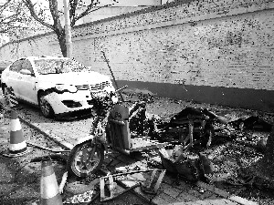 昨日,北京晨報(bào)記者來到酒仙橋二街坊附近,在1號樓樓下聚著一群人,正在討論凌晨爆炸的事情,“簡直就是個移動隱患”,“還好不是白天,不然肯定有人受傷”。記者看到,一輛綠色三輪車嚴(yán)重?fù)p毀,車輪扭曲倒在地上,車身部分被炸成了一張橫鋪著的大鐵皮,經(jīng)過灼燒后變得焦黑。三輪車的部分零件丟失,旁邊的樹上掛著鐵條,十幾米外的墻邊散落著三輪車的架子,而車輛原本放置電瓶的地方空無一物。在三輪車旁,一個大煤氣罐被炸成三部分,中間圓筒狀變成一塊鋪展后約1平方米的厚鐵皮,上下兩端則變成兩個圓形的蓋子(如圖)。