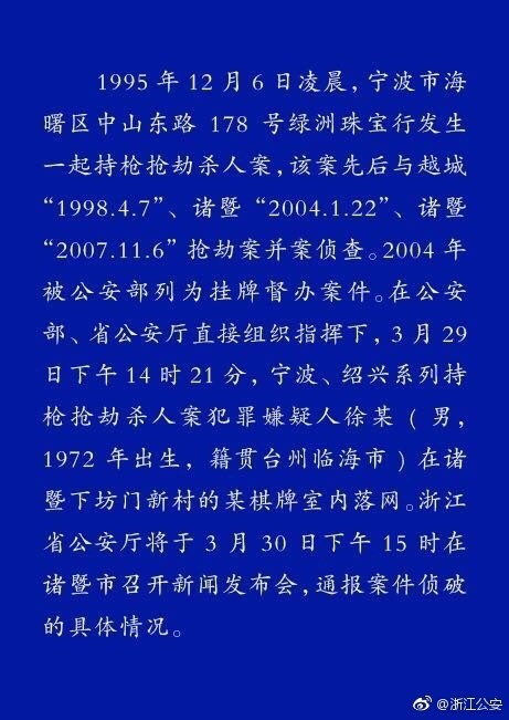 最新消息:浙江省公安廳將于3月30日下午15時在諸暨市召開新聞發(fā)布會,通報案件偵破的具體情況。