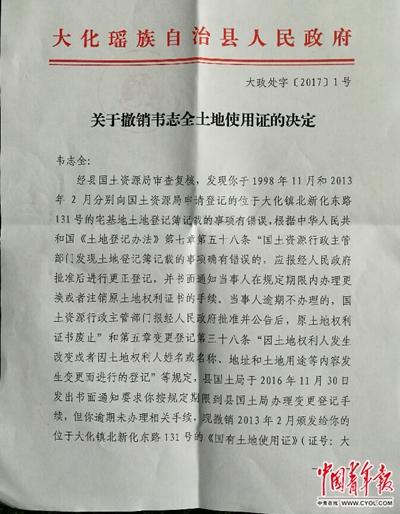 2月9日,大化縣人民政府下發(fā)大政處字〔2017〕1號(hào)文《關(guān)于撤銷韋志全土地使用證的決定》。 中國(guó)青年報(bào)·中青在線記者 謝洋/攝