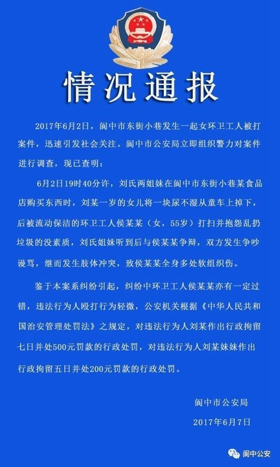 6月2日,閬中市東街小巷發(fā)生一起女環(huán)衛(wèi)工人被打案件,迅速引發(fā)社會(huì)關(guān)注。閬中市公安局立即組織警力對(duì)案件進(jìn)行調(diào)查,現(xiàn)已查明: