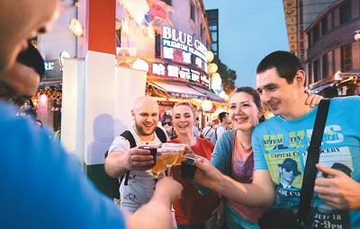 6月8日,來自烏克蘭的游客在浙江寧波老外灘品嘗美酒。新華社記者 翁忻旸攝