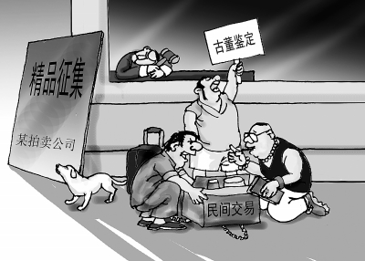 中小拍賣行大批停業(yè),大拍賣行又看不上他們的藏品,普通民間收藏者只好在馬路邊交易。漫畫 王鵬