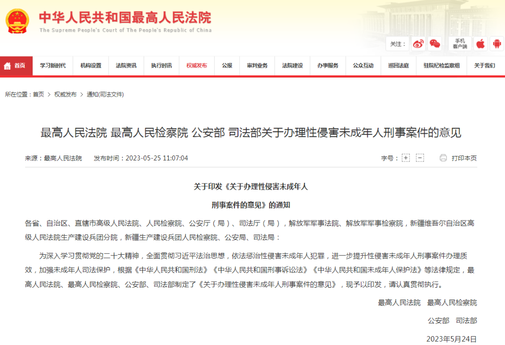 最高人民法院、最高人民檢察院25日聯(lián)合發(fā)布關(guān)于辦理強奸、猥褻未成年人刑事案件適用法律若干問題的解釋。最高人民法院、最高人民檢察院、公安部、司法部聯(lián)合發(fā)布關(guān)于辦理性侵害未成年人刑事案件的意見。