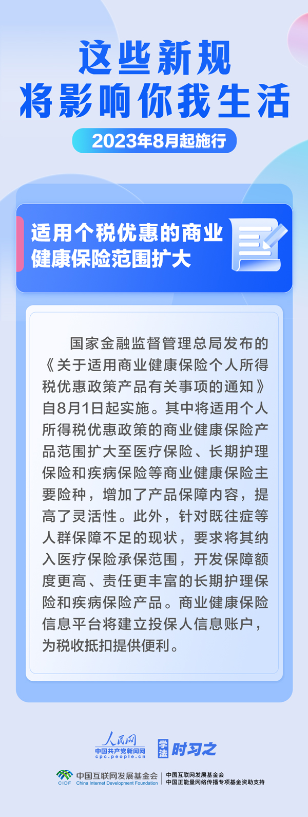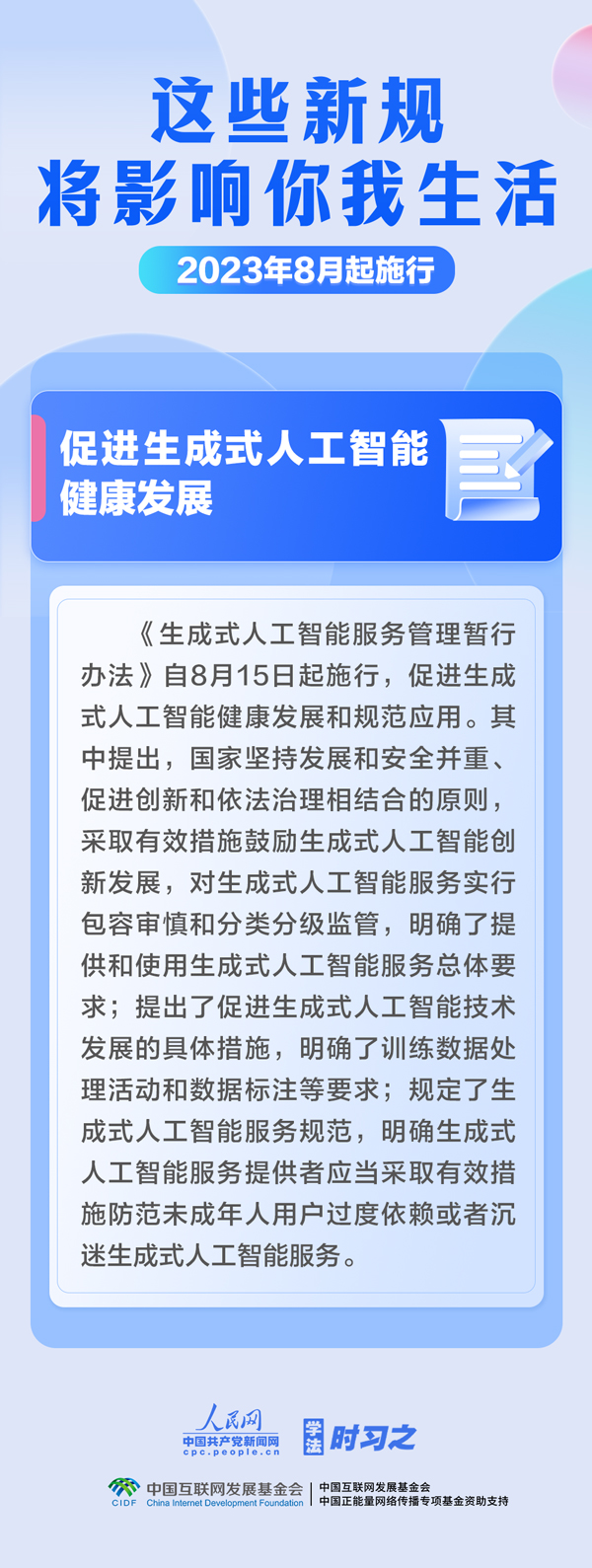 促進(jìn)生成式人工智能健康發(fā)展;擴(kuò)大適用個(gè)稅優(yōu)惠政策的商業(yè)健康保險(xiǎn)產(chǎn)品范圍;明確經(jīng)營(yíng)性人力資源服務(wù)機(jī)構(gòu)不得向個(gè)人收取押金……8月,這些新規(guī)施行,將影響你我生活。