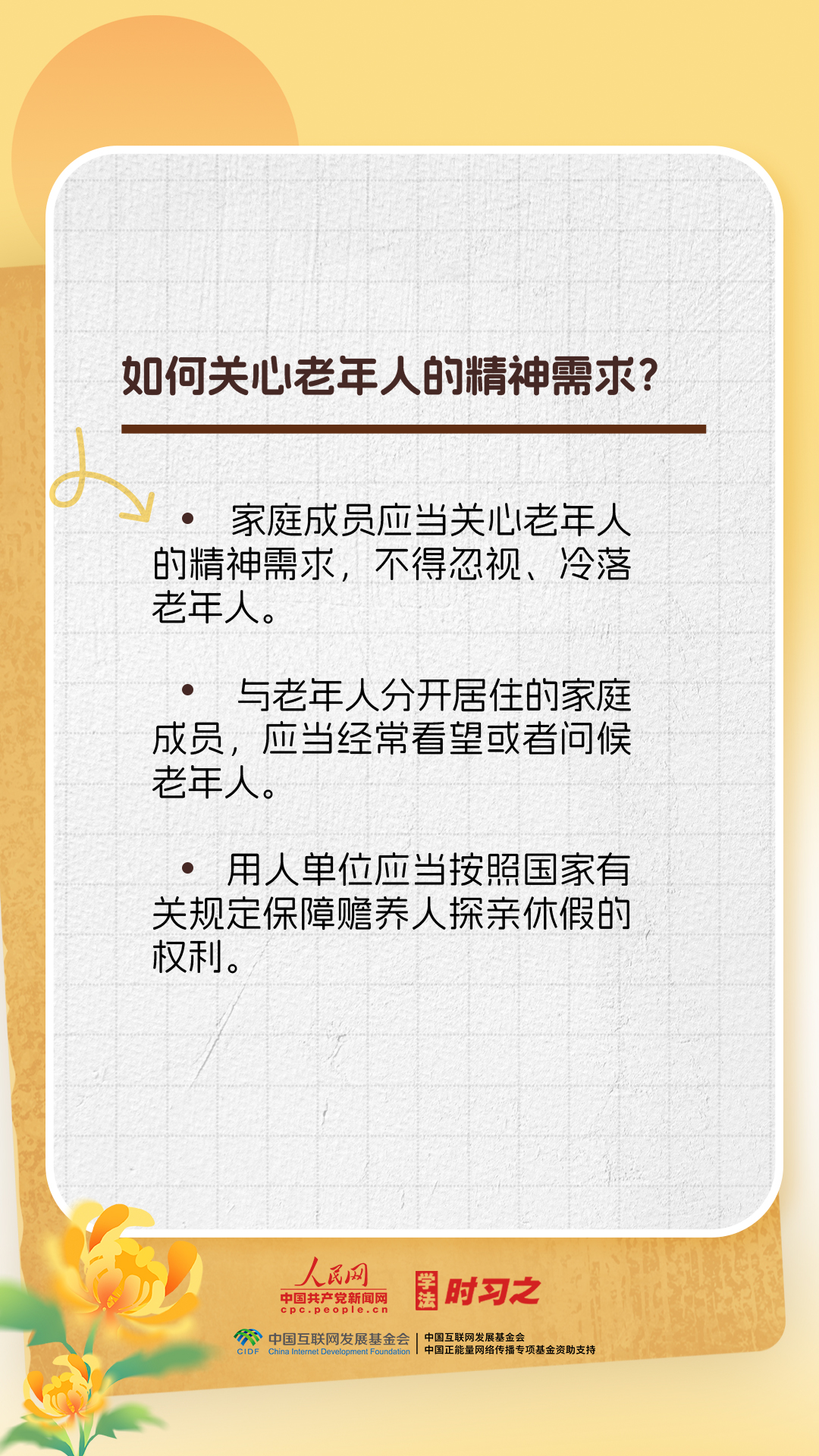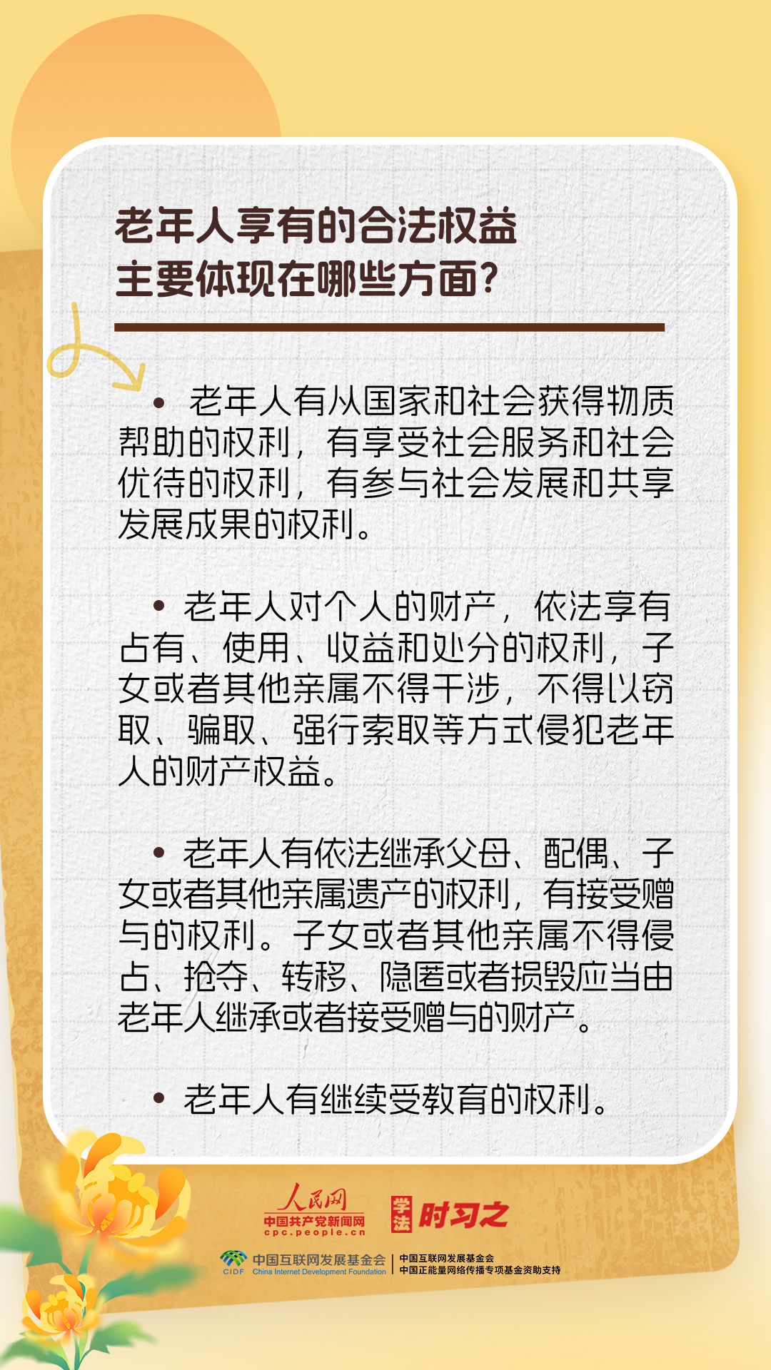 《中華人民共和國(guó)老年人權(quán)益保障法》的出臺(tái)進(jìn)一步保障了老年人的合法權(quán)益,弘揚(yáng)了中華民族敬老、養(yǎng)老、助老的美德。重陽(yáng)節(jié),一起來(lái)了解老年人權(quán)益保障法的相關(guān)規(guī)定。