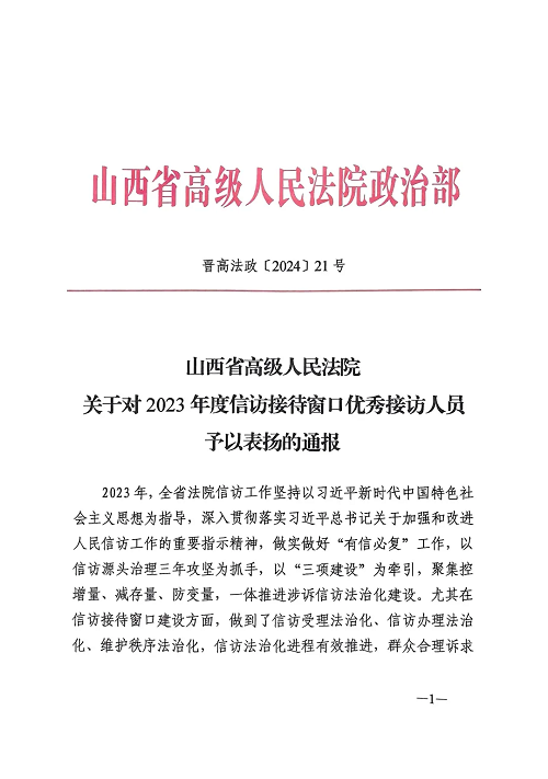 近日,山西省高級人民法院下發(fā)《關(guān)于對2023年度信訪接待窗口優(yōu)秀接訪人員予以表揚(yáng)的通報》,忻州法院2名干警榜上有名。忻州中院黨組書記、院長栗向東作出批示,要求全市法院干警以受到表揚(yáng)的同志為榜樣,愛崗敬業(yè),爭當(dāng)先進(jìn),爭創(chuàng)一流工作業(yè)績。