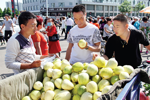 5 月29 日,原平市王家莊鄉(xiāng)弓家莊村的農(nóng)民正在農(nóng)貿(mào)市場(chǎng)銷售大棚香瓜、蔬菜。近年來,該市加大財(cái)政扶持力度,加快產(chǎn)業(yè)結(jié)構(gòu)調(diào)整,大力發(fā)展蔬菜大棚。目前,該村戶均1座大棚,人均產(chǎn)值1.5 萬元。(褚震 攝)