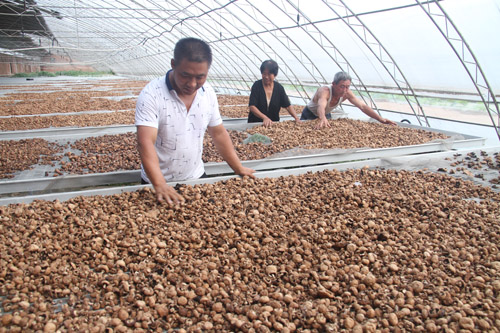 8月1日,原平市雙惠現(xiàn)代農(nóng)業(yè)示范園區(qū)日光溫室大棚內(nèi)工作人員正在整理雙孢菇進(jìn)行晾曬,制作成干蘑菇,準(zhǔn)備淡季銷售。該園區(qū)充分利用溫室晾曬有效聯(lián)接,延長蘑菇銷售時間,增加菇農(nóng)收入。(褚震 攝)